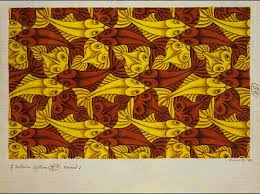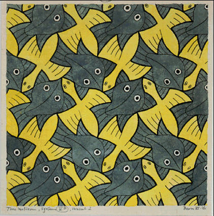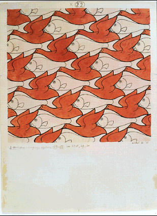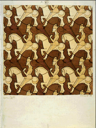 La característica principal de Escher en sus particiones es que los motivos elegidos representan algo concreto y reconocible por todos y no solo formas geométricas.